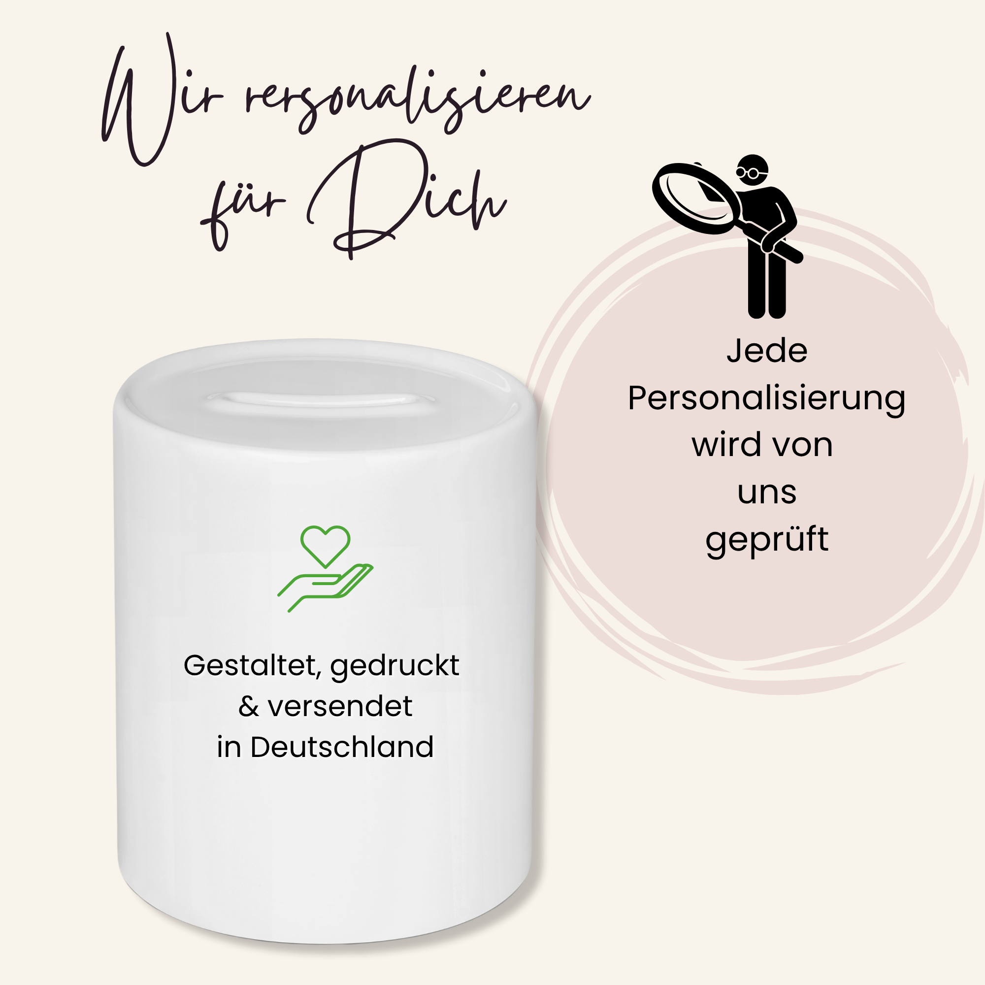 Wir möchten, dass dein Produkt perfekt ist. Solltest du versehentlich einen Fehler bei der Personalisierung gemacht haben, gewähren wir dir einen einmaligen, kostenlosen Ersatz.