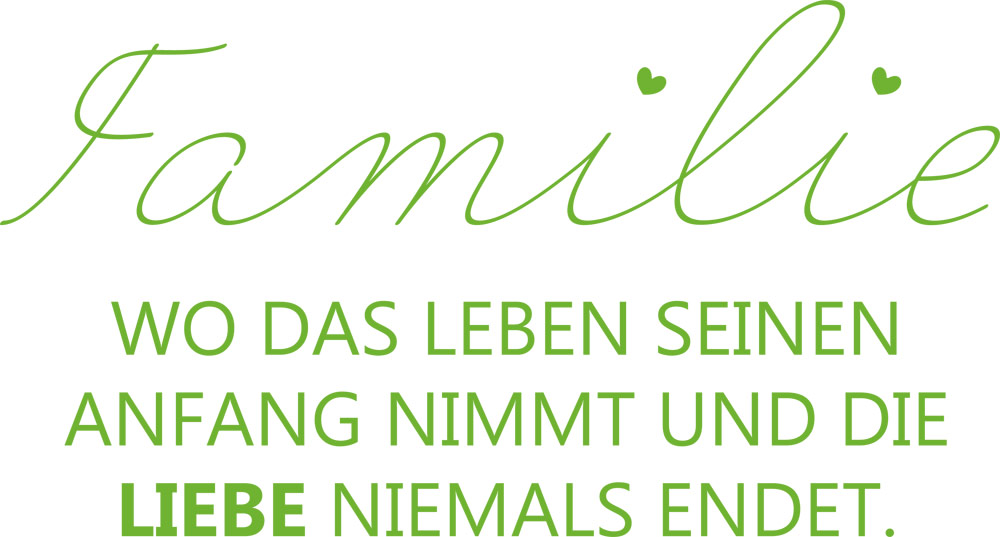 Eltern, Kinder, Geschwister - es gibt so viele Mitglieder in Deiner Familie, die Dir am Herzen liegen. Warum zeigst Du es nicht auch? Das Wandtattoo Familie für das Wohnzimmer ist dafür genau richtig. Es ist auffällig und stellt auf den ersten Blick klar, für wen Dein Herz schlägt. Wie bei all unseren Produkten kannst Du natürlich auch das Wandtattoo Familie für das Wohnzimmer perfekt an die Gestaltung des Raumes anpassen.